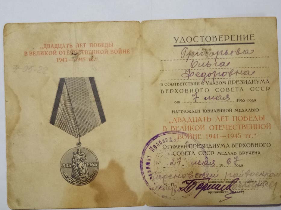 От имени Президиума Верховного Совета СССР медаль вручена 27 мая 1967г.