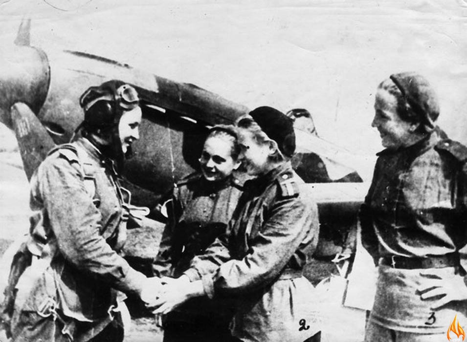 (Памятных Тамара Устиновна - летчик, Е. Д. Борок - механик, И. М. Фаворская - моторист, М. Кокина - вооруженец)