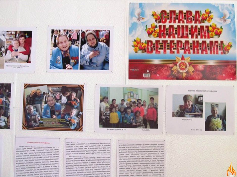 Шутова Анастасия Евстафьевна Была командиром взвода медсанроты. Боевой путь: Северный Кавказ, освобождение Румынии, Польши, Чехословакии, Болгарии. Победу встретила в Чехословакии. Из Чехословакии подразделение перевели в Австрию и пробыли до июня 1945 года.