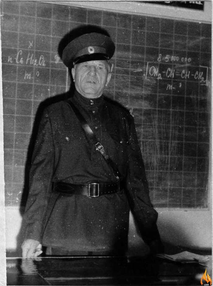 (Фото из семейного архива Любибогова Филиппа Николаевича. Старший урядник Любибогов выступает перед студентамив кабинете химии)