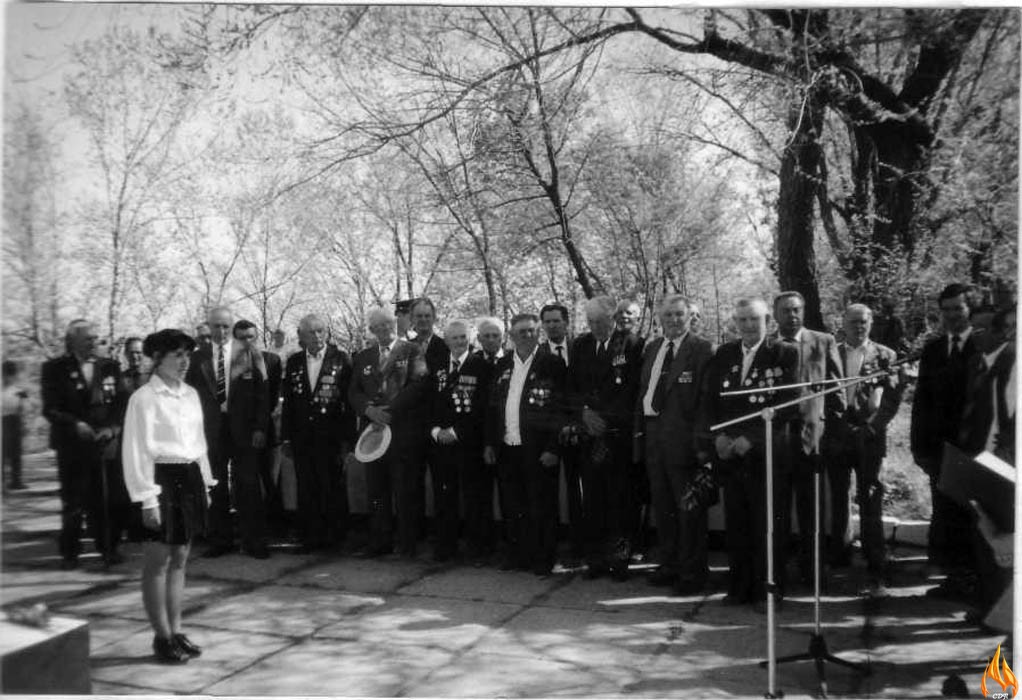 (Фото из семейного архива Любибогова Филиппа Николаевича. Члены президиума у памятника погибшим комсомольцам в годы воины, дедушка склонил голову.)