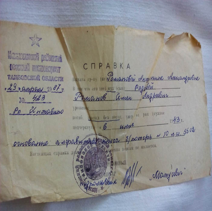 Вот справка о том, что Романов Семен Андреевич пропал без вести 6 июля 1943 года.