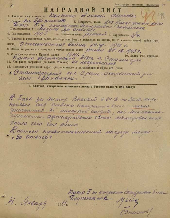 Наградной лист Колченко Алексея Ивановича - пять лет войны воевал в пехотных подразделениях Красной Армии.