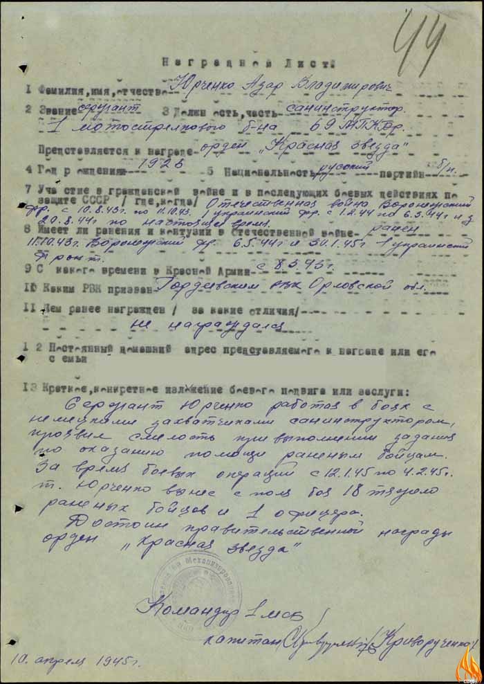 Войну прошел в звании сержанта, санитар инструктор первого мотострелкового батальона.