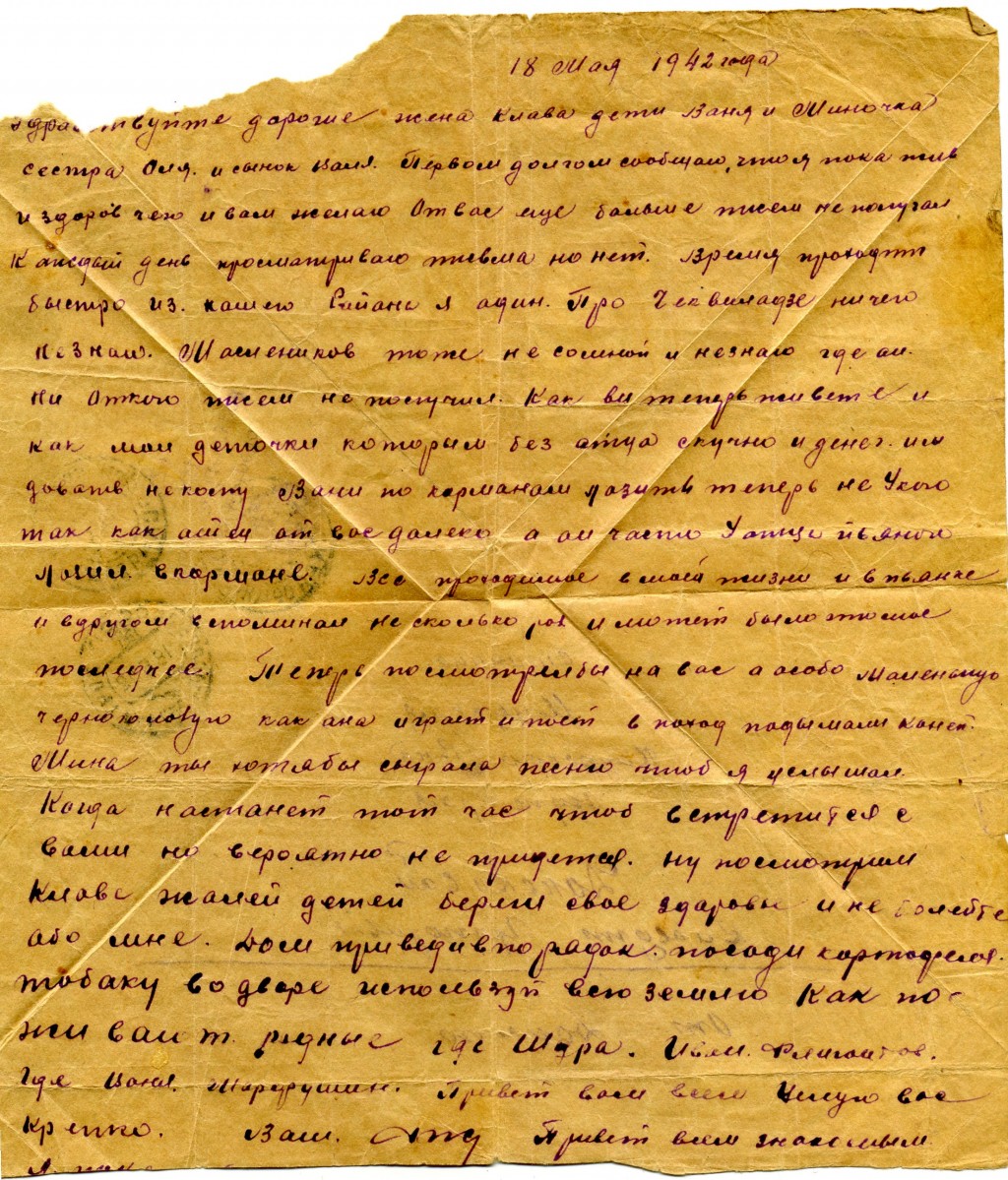 Семейные реликвии Донскова Петра Ивановича Единственное уцелевшее письмо датированное 18 мая 1942 года