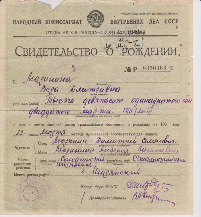 Свидетельство о рождении Васичкиной (дев. Маринина) Веры Дмитриевны