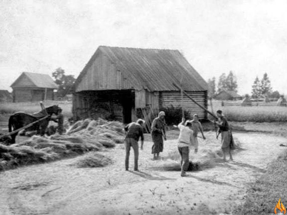 Практически все лето были в поле. Ночевали в полевой будке, там же и ели. Домой не ходили, не отпускал бригадир. Было много работы. Зимой очищали зерно, веяли, готовили к севу.