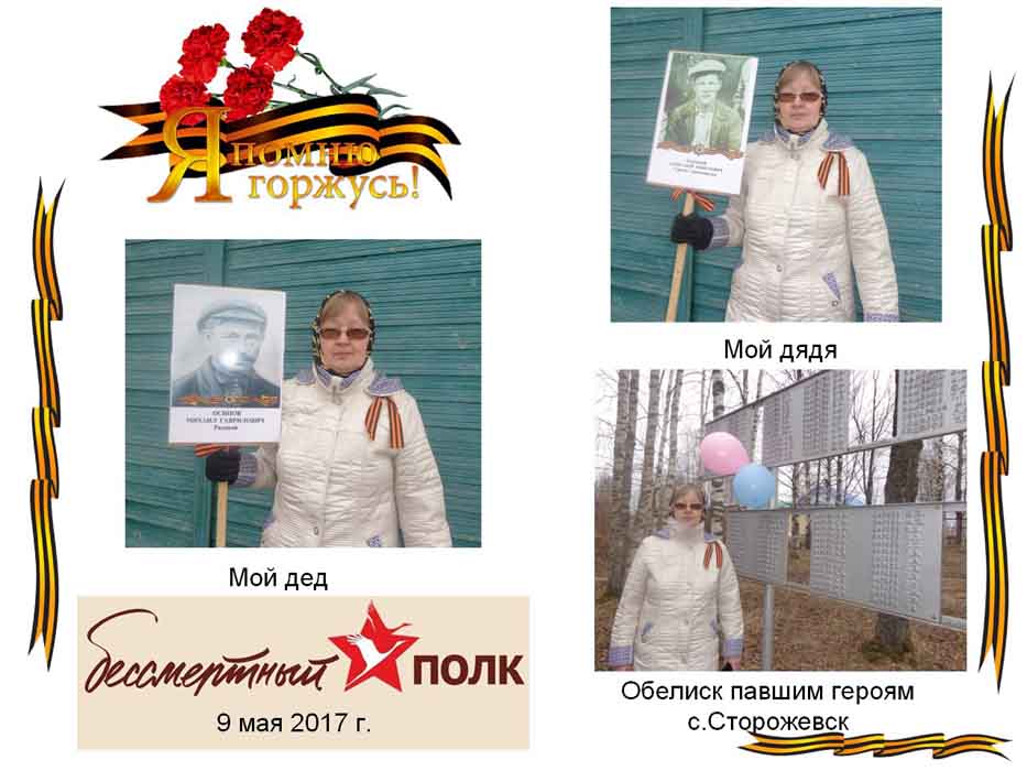 Благодарные внуки, правнуки и праправнуки из рода ГАБЭ МИШ (с. Сторожевск Корткеросский район Республика Коми) в строю с героями своего рода! Поколения сплелись воедино! Героям слава! Нас не победить!
