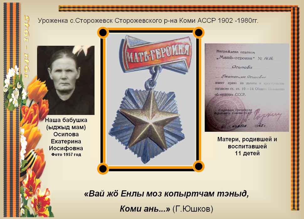 - 21 ноября 1945 года, Указом Президиума Верховного Совета СССР от 5 мая 1945 года, присвоено почетное звание «Мать - героиня».