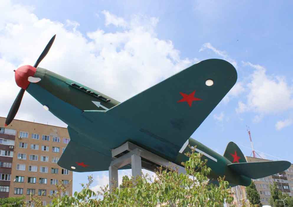 Самолет Як-1 установлен на пятиметровом постаменте в самом центре Камышине