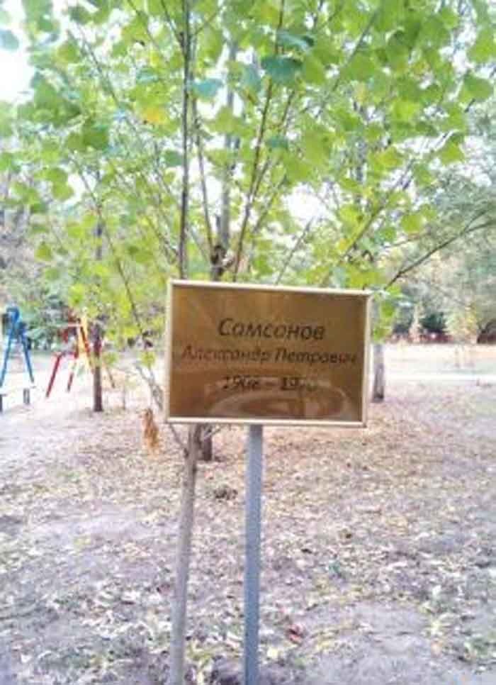 В городском парке нашего города Дубовка в память о моем прадедушке поставлена табличка с его именем и посажен тополь.