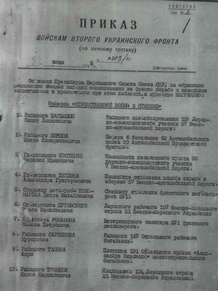 Семейные реликвии Шуваева Георгия Фёдоровича - Приказ о награждении. Под номером 255- фамилия плотника Шуваева Г.Ф.