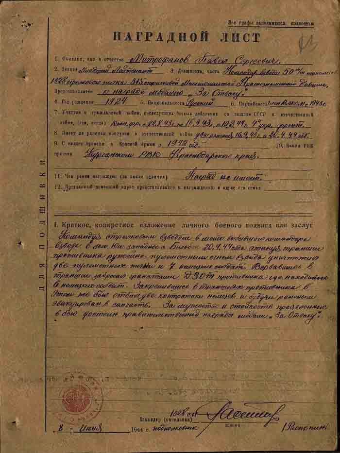- Награды: Медаль «За отвагу», Орден «Красной звезды».