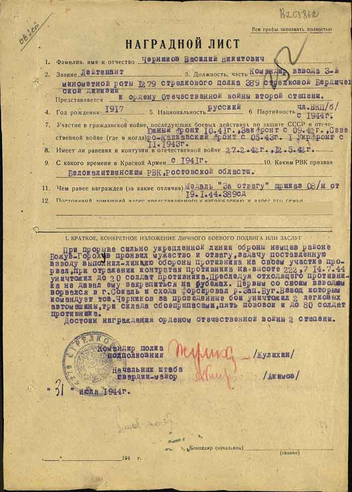 Черников Василий Никитович - В возрасте 24-х лет ушёл на фронт в июне 1941 года.