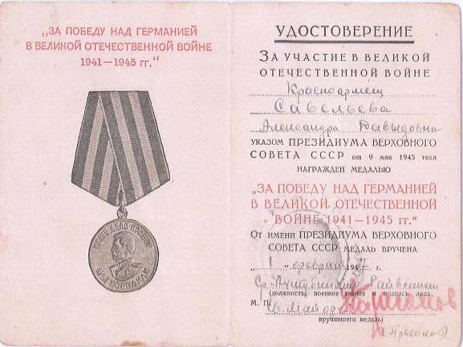 Александра Давыдовна награждена медалью «За победу над Германией в Великой Отечественной войне 1941 – 1945 гг.»