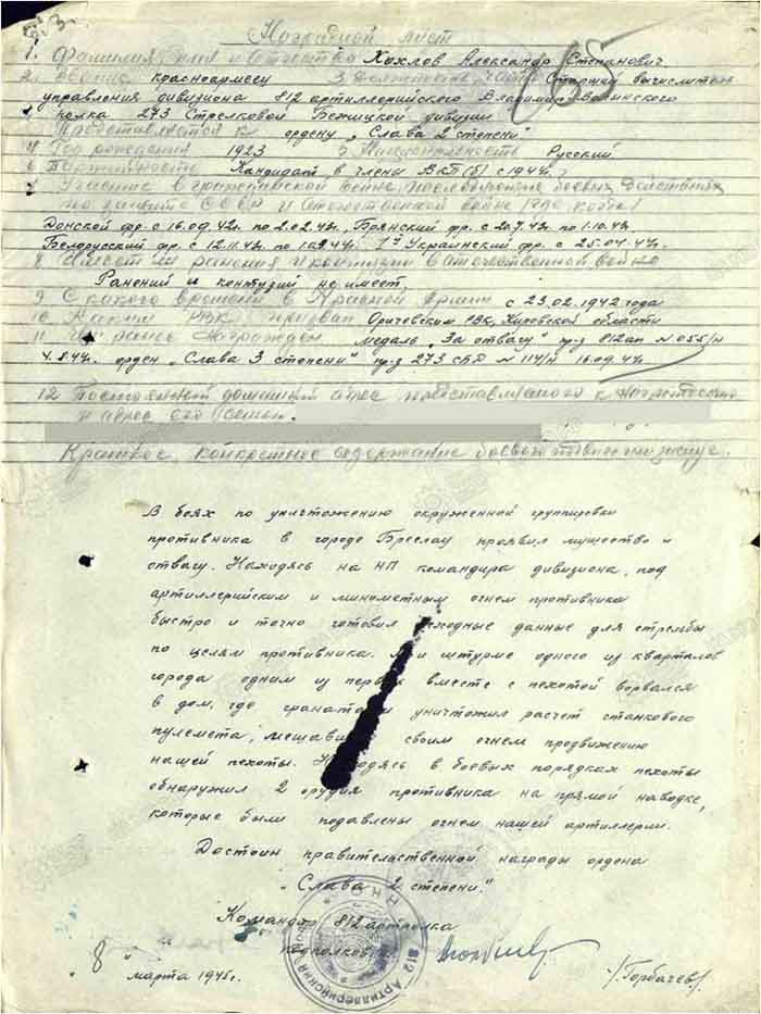 За бои на реке Луга, приказом от 4 августа 1944 года 4 Гв.Армии 2 Украинского фронта Хохлов Александр Степанович награжден Медалью За отвагу.