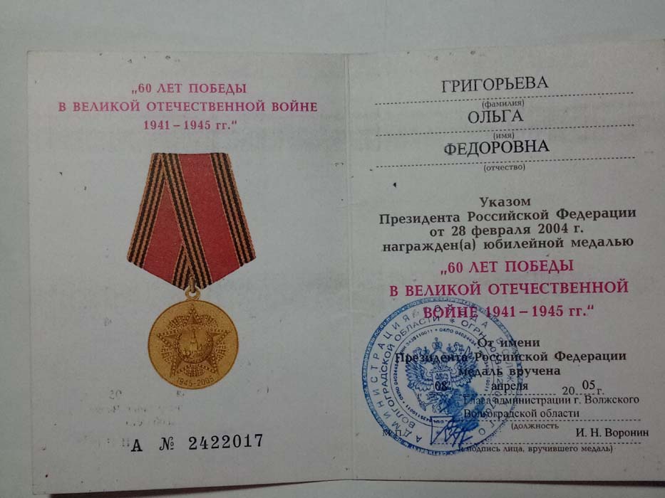 От имени Президента РФ медаль вручена 8 апреля 2005г.
