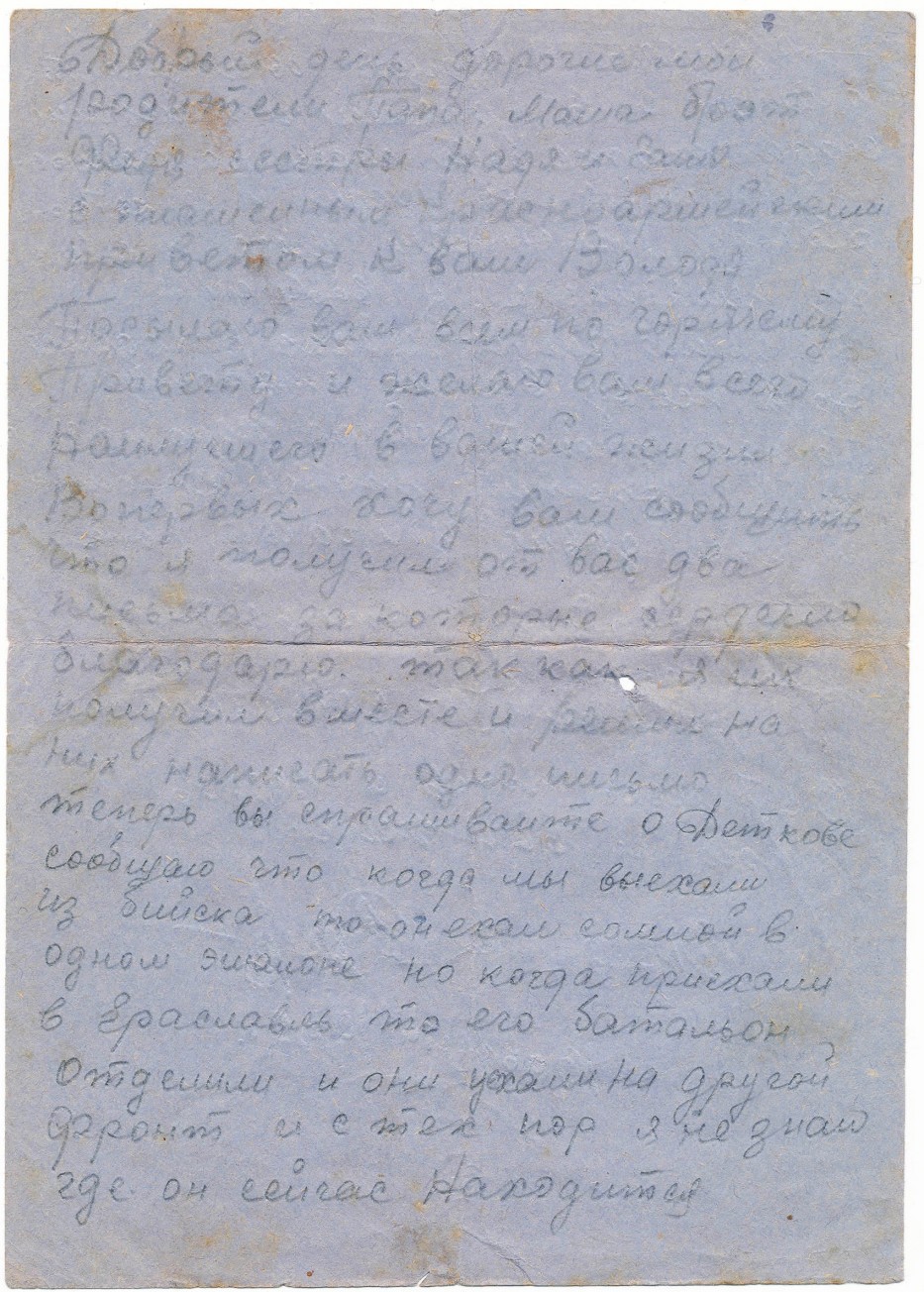 Доровских Владимир Яковлевия. Письмо с фронта на листе сине-серой бумаги от 13 августа 1942г. Возможно с марша, из под Воронежа. Жить герою осталось 47 дней. Стр.1.