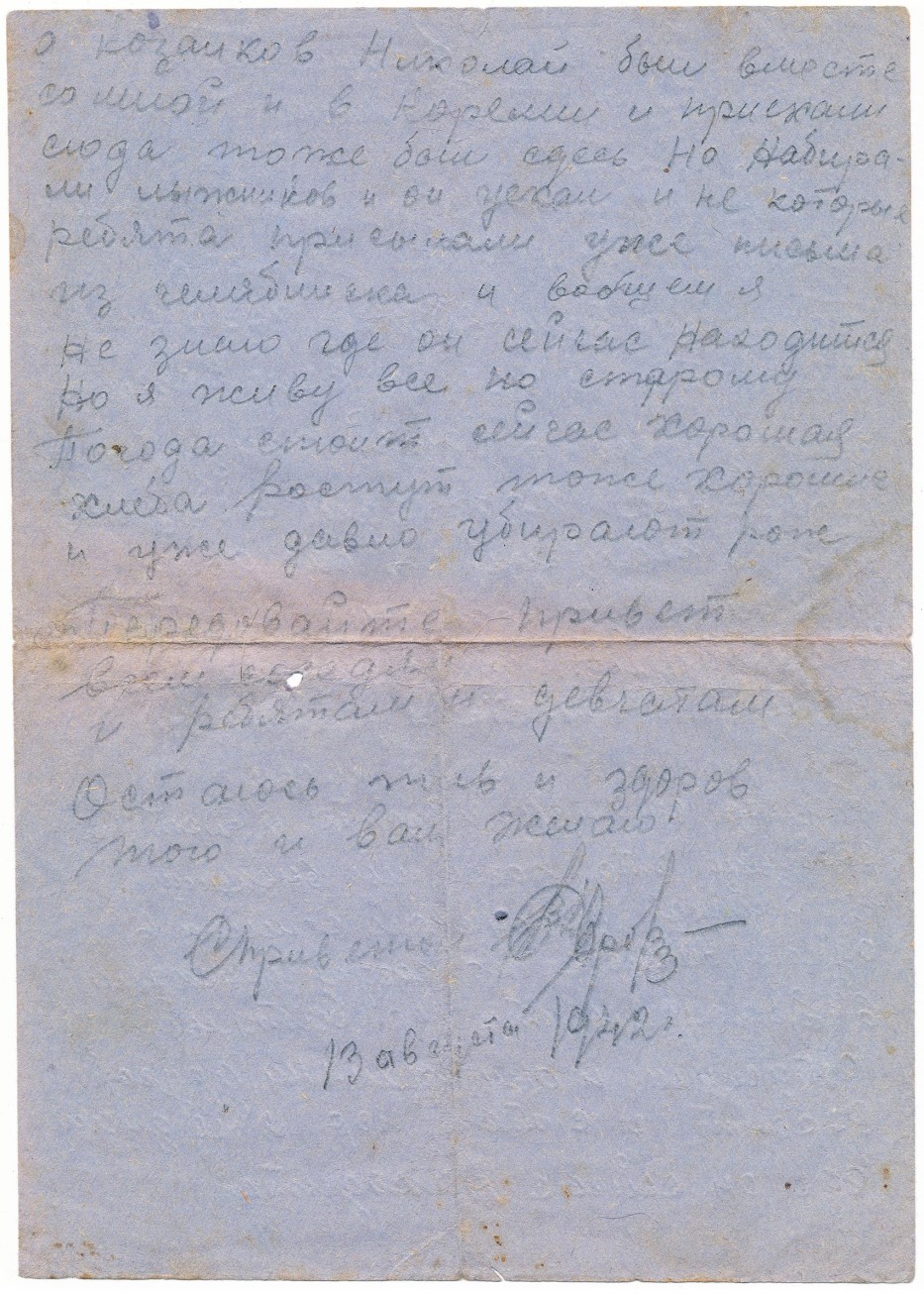 Доровских Владимир Яковлевия. Письмо с фронта на листе сине-серой бумаги от 13 августа 1942г. Возможно с марша, из под Воронежа. Жить герою осталось 47 дней. Стр.2.
