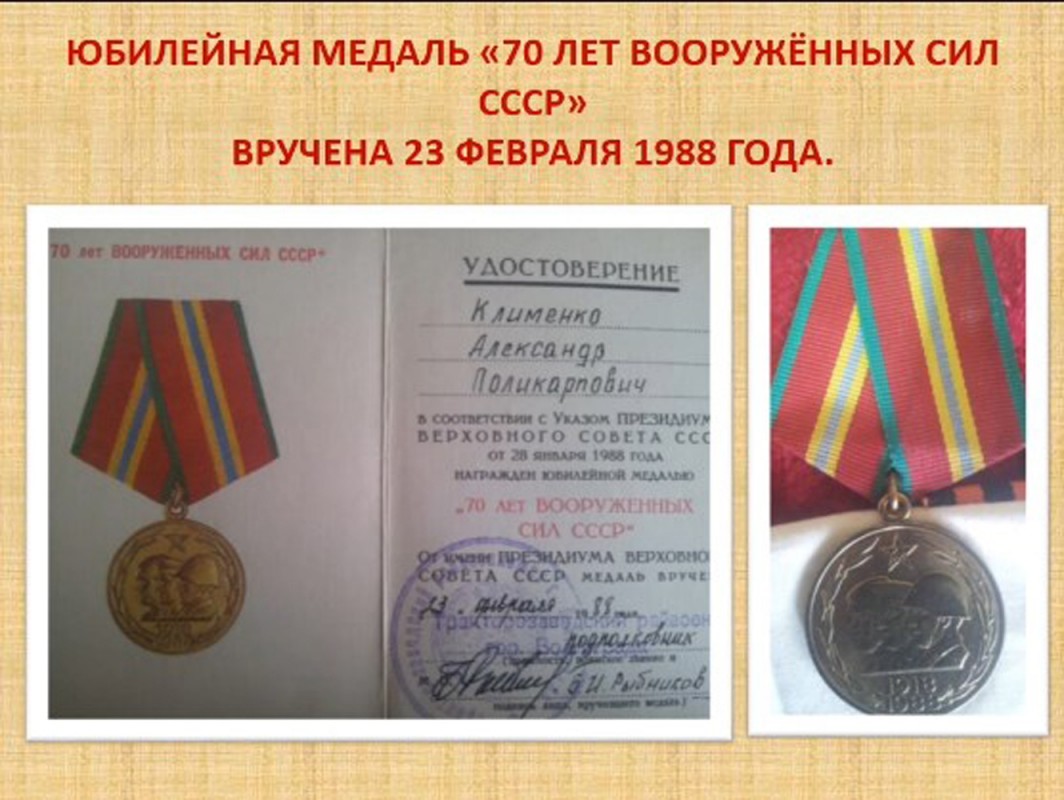 Награды Клименко Александра Поликарповича Получив звание сержанта, в 1942 году был отправлен на Сталинградский фронт. После освобождения Сталинграда в 1943 году, в звании старшего сержанта, остался восстанавливать город и тракторный завод.