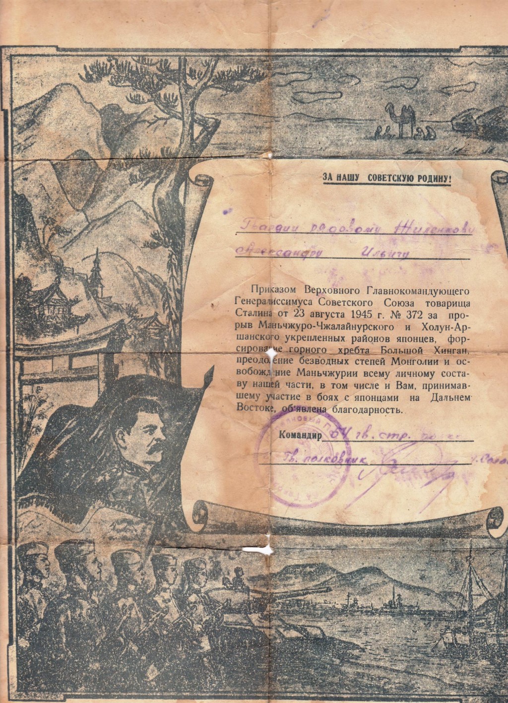 Награды Жиленкова Александра Ильича, участник аВеликой Отечественной войны. 54 стрелковый полк 6 стрелковой роты стрелок. Участвовал в войне против Японии.