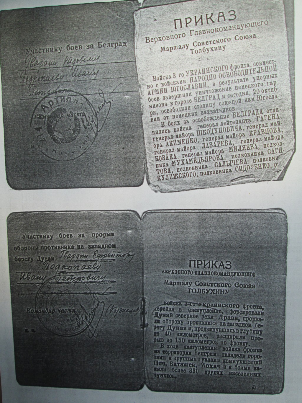 Благодарность Подкопаеву И.П. за участие в боях за Белград , за прорыв обороны противника на западном берегу Дуная.