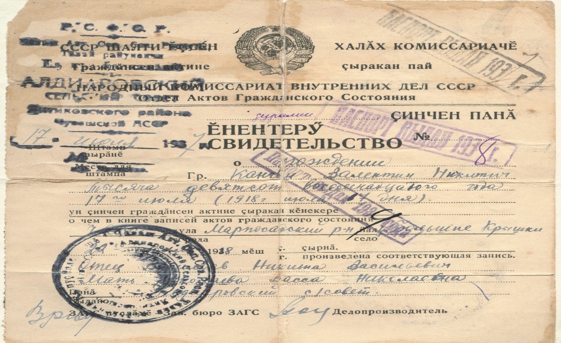 Свидетельство о рождении Кангина Валентина Никитича
