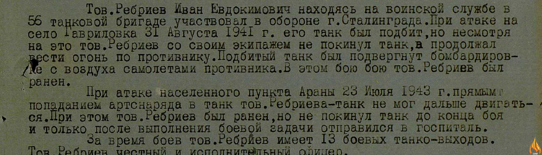 "Иван Евдокимович Ребриев находясь на военной службе в 56 танково бригаде участвовал в обороне города Сталинграда.