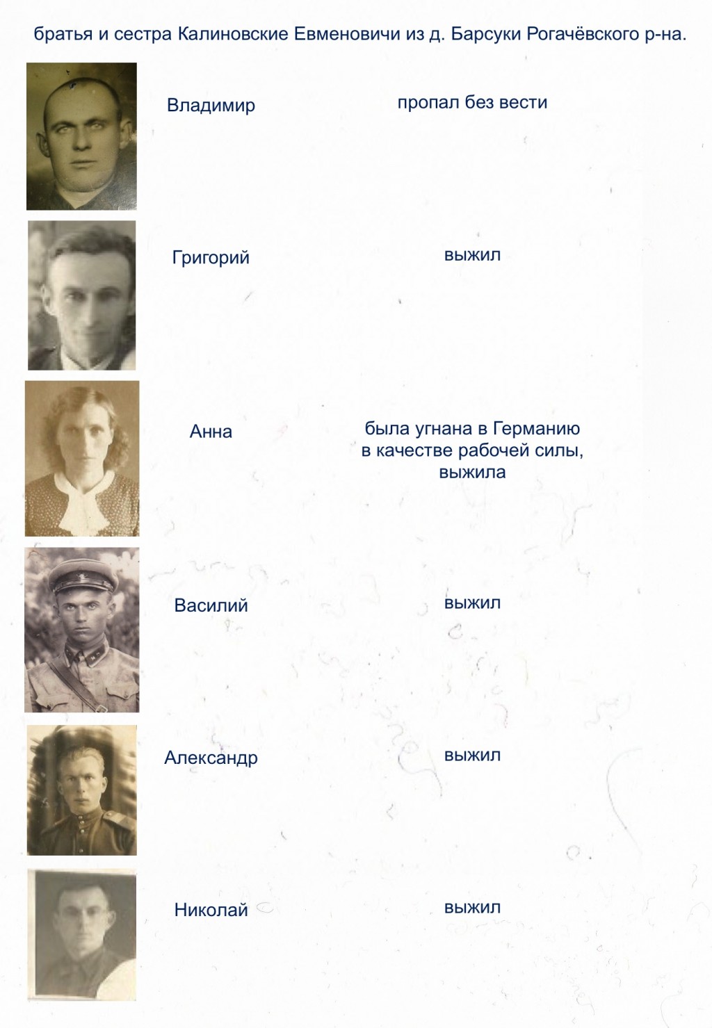 Все дети Евмена Калиновского воевали. Во время оккупации в Белоруссии их престарелый отец остался в деревне. Кто-то предал, что все сыновья в советской армии, поэтому в припадке ярости противник выстрелил в ногу старика и выгнал его. Жил отец в сарае и дожил до Победы.