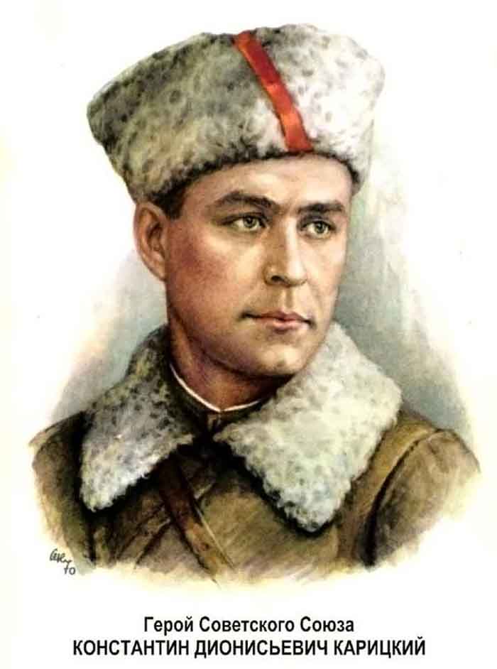 Карицкий Константин Дионисьевич - Кадровый офицер-пограничник командир 5-й Ленинградской партизанской бригады. За период боевых действий бригада восстановила Советскую власть в 367 населенных пунктах и спасла от угона в рабство более 40 тысяч мирных советских людей.