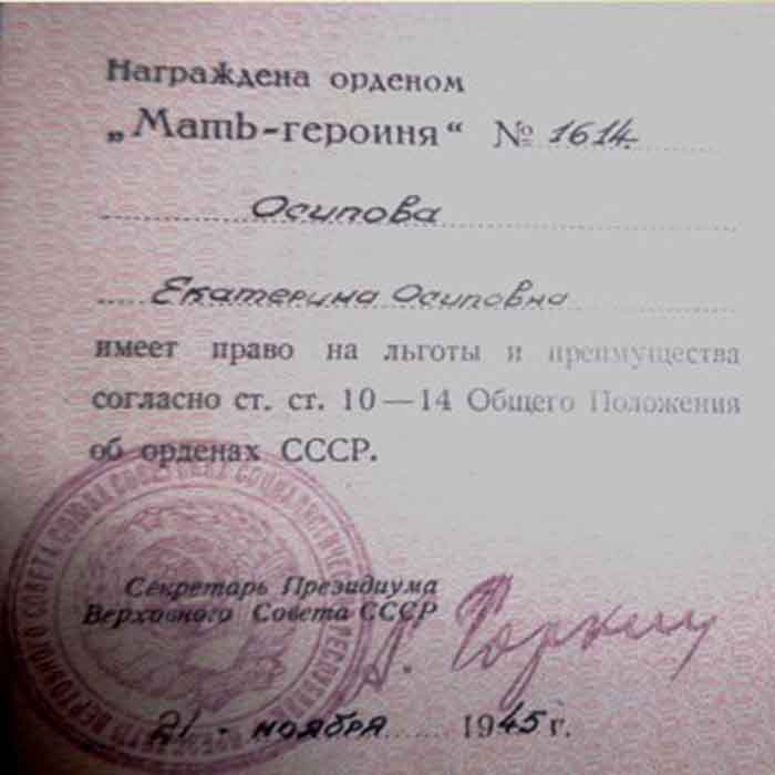- 21 ноября 1945 года, Указом Президиума Верховного Совета СССР от 5 мая 1945 года, присвоено почетное звание «Мать - героиня».