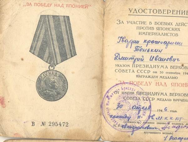 Семейные реликвии Тенькина Дмитрия Ивановича - Прошёл с боями по дорогам войны до победного 1945 года, а затем принимал участие в войне с Японией на Дальнем Востоке.