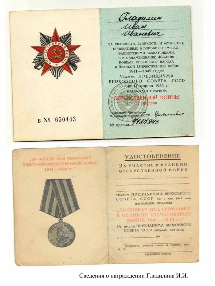 Гладилин Иван Иванович, родился 23 сентября 1920 года в с.Терса Еланского района Сталинградской области. Был призван на службу в октябре 1940 года и был демобилизован в марте 1946 года. Великую отечественную войну закончил в звании младший сержант, в должности - старший телефонист. Свой боевой путь прошел в 26 гвардейской пушечной артиллерийской бригаде в составе 51 Армии Прибалтийского фронта.