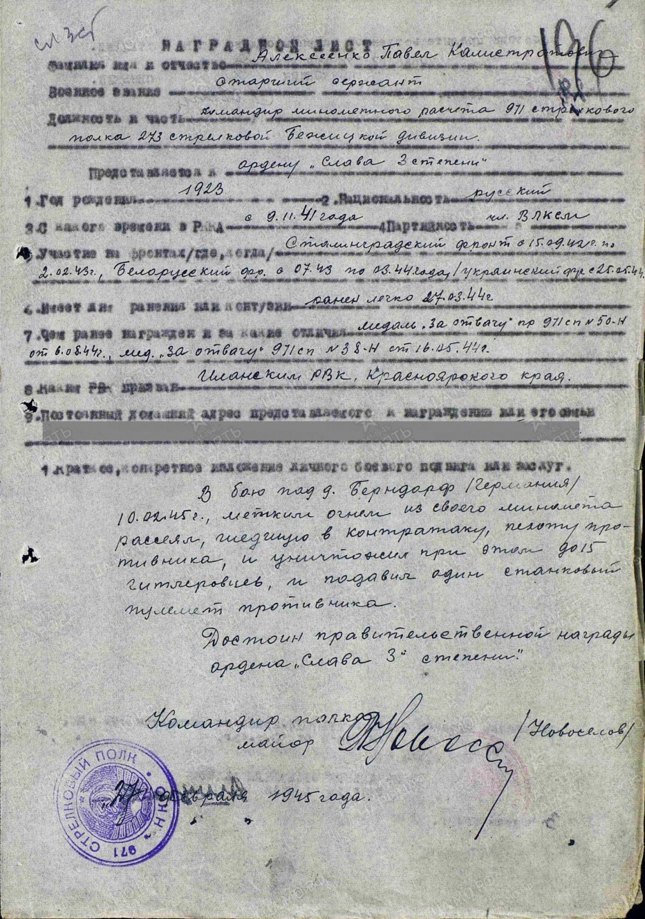 Наградной лист Алексеенко П. К.