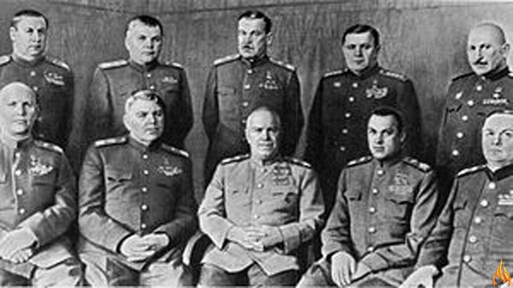 Командующие фронтами на заключительном этапе войны. В 1-м ряду (слева направо): И.С. Конев, А.М. Василевский, Г.К. Жуков, К.К. Рокоссовский, К.А. Мерецков; во 2-м ряду: Ф.И. Толбухин, Р.Я. Малиновский, Л.А. Говоров., А.И. Еременко, И.Х. Баграмян
