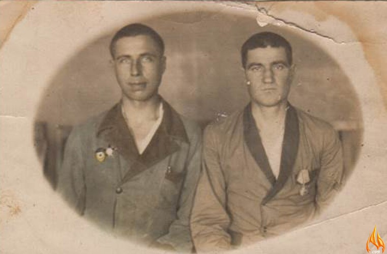 На фронт в действующую армию призван летом 1942 года. Меткий стрелок, он был и пулеметчиком станкового пулемета «Максим», и снайпером. (на фото справа)