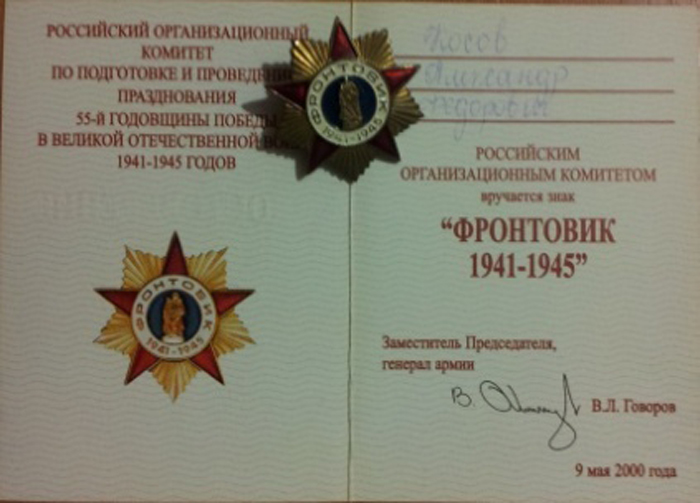Награды Косова Александра Федоровича 25 марта 1944 он принял присягу и попал в 137 полк НКВД в должности рядового телефониста и воевал на 2-ом Белорусском фронте.