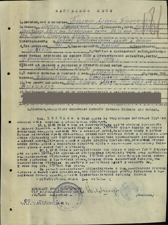 Терехин Алексей Тимофеевич, 1921 г.р., гв. лейтенант, награжден