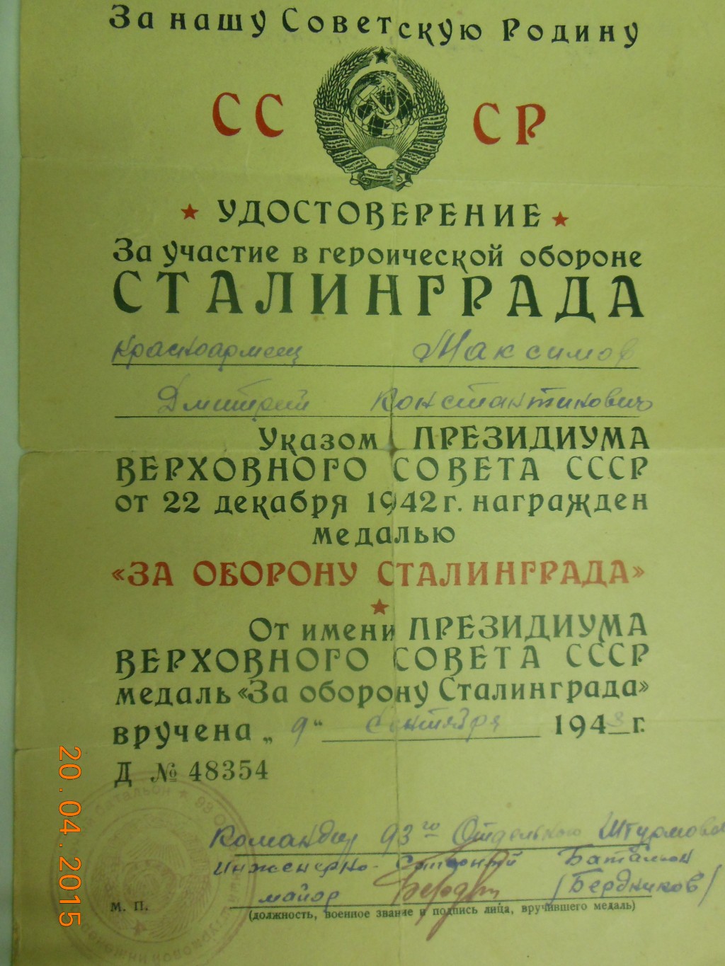 Медаль "За оборону Сталинграда" Максимов Д.К.