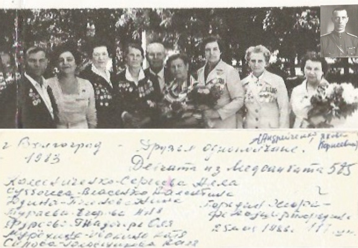 В городе Волгоград (Сталинград) 25.05.1983 года в школе N 117 встречались друзья однополчане деда Я.К.Андрейченко. Его уже не было в живых. Послали его семье эту фотографию участники войны. Может быть кто-нибудь из Вас, дорогие посетители, узнает своих бабушек или прабабушек…. Девчата из Медсантата 585. Колесниченко-Сергеева Алла Суббочеса-Власенко Валентина Юдина-Поленова Нина Тураева-Егорева Аня Фурсова-Гнадоберг Оля Мурёхина-Ивакина Катя Силова-Головщикова Галя Перьдин Жора - фельдшер в середине