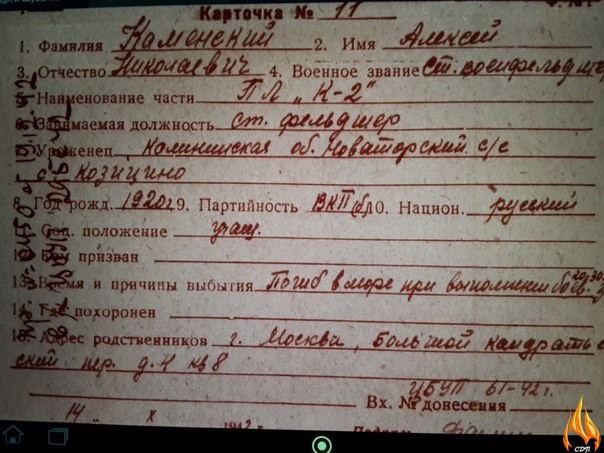Старший военфельдшер советской дизель-элетрической подводной лодки "К-2" Каменский Алексей Николаевич (1920 - 19.09.1942 гг)