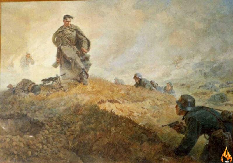 8 ноября 1941 года в ожесточённом оборонительном бою на окраине села Дьяково, Луганской области, Хусен Андрухаев, окруженный гитлеровцами, крикнул «Русские не сдаются!» и подорвал себя и окруживших его вражеских солдат связкой противотанковых гранат...