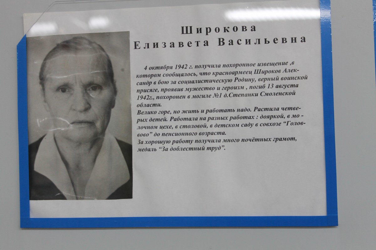 Широкова Елизовета Васильевна, в 1942 году получила извещение о смерти своего мужа, погиб героически за Родину в д. Степанки Смоленской области. Оставшись одна с четырьмя детьми, работала дояркой, трактористкой в совхозе "Головково" Наро-Фоминском районе МО.
